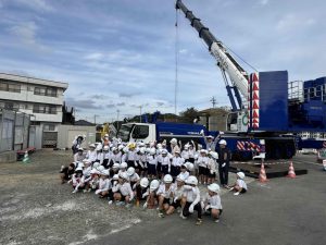 児童たちはヘルメットをかぶり、450トンの大型クレーンが橋を架ける様子を間近で体験。「こんな大きな機械を見たのは初めて!」「大きくなったらクレーンの運転手になりたい!」と目を輝かせながら話してくれました。